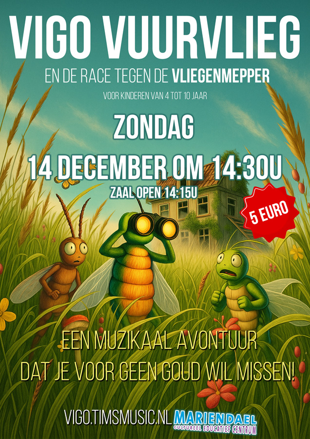 Op zondagmiddag 14 december komt Tims Music naar Mariëndael om hun muzikale voorstelling Vigo Vuurvlieg en de race tegen de vliegenmepper te spelen.