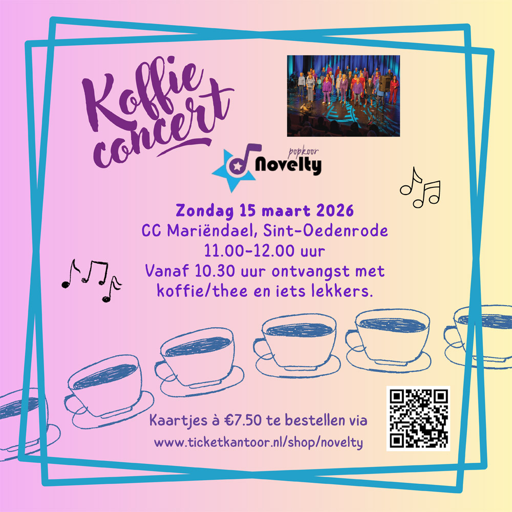 Popkoor Novelty organiseert op zondagochtend 15 maart een koffieconcert. Naast de heerlijke muziek worden bezoekers ook getrakteerd op een kopje koffie met iets lekkers erbij!
